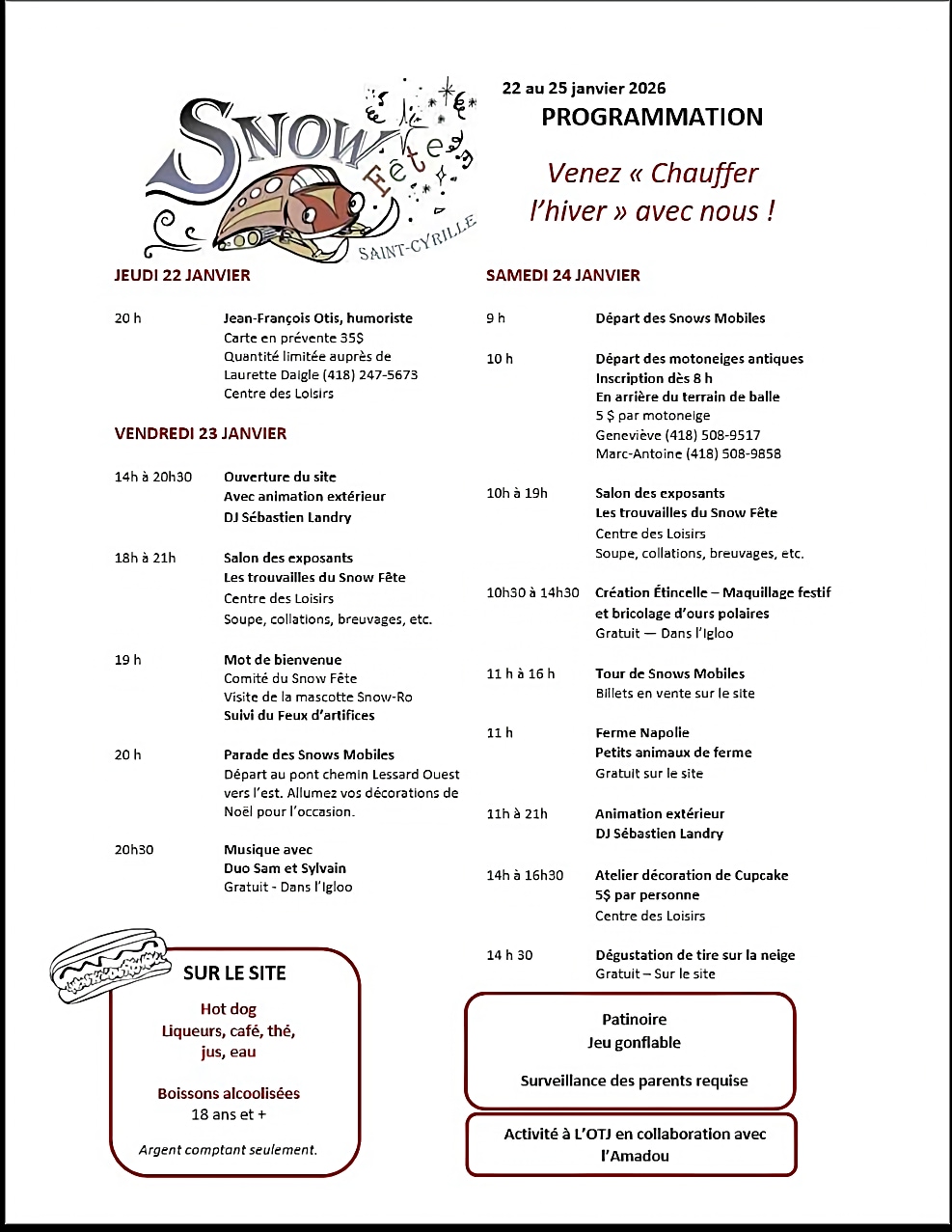 Ne manquez pas la randonnée de la Snow Fête à Saint-Cyrille de Lessard qui se déroulera le 24 janvier 2026!